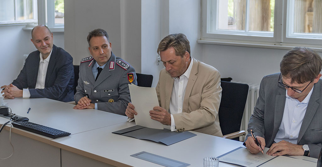 Für die Universität wurde die Kooperationsvereinbarung von deren Präsident, Prof. Oliver Günther, Ph.D., und vom Lehrstuhlinhaber Prof. Dr. Sönke Neitzel unterschrieben. Für das ZMSBw zeichneten dessen Kommandeur, Oberst Dr. Sven Lange, sowie der Abteilungsleiter Forschung des Zentrums, Dr. Heiko Biehl.