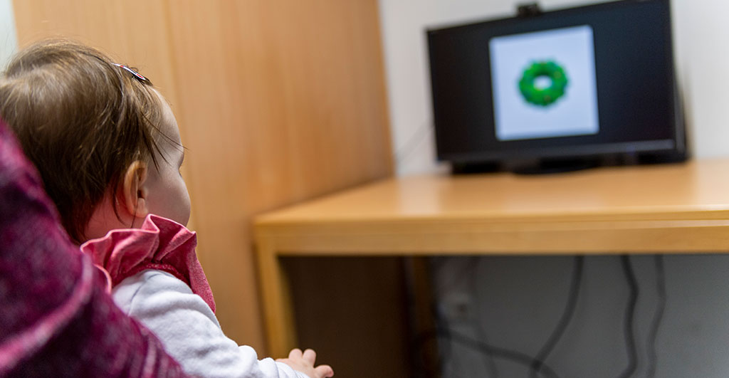 „Puk, puk, puk …“ Nanu, jetzt erscheint der rote Gegenstand und nicht der „grüne Donut“ auf dem Bildschirm. Das ist seltsam! Mathilde schaut länger als zuvor auf das Objekt. Laborleiter Tom Fritzsche hält die Zeit per Knopfdruck fest. „Ob das Kind länger hinsieht, wird erst anhand der aufgezeichneten Zeiten ausgewertet“, erklärt er. „In normalen Testungen weiß ich nicht, was gerade gezeigt wird, und bin daher ebenso ‚blind‘ wie die Eltern.“ Bei diesem Testexperiment kann er sich jedoch sofort freuen: Mathilde hat genauso reagiert wie erhofft.