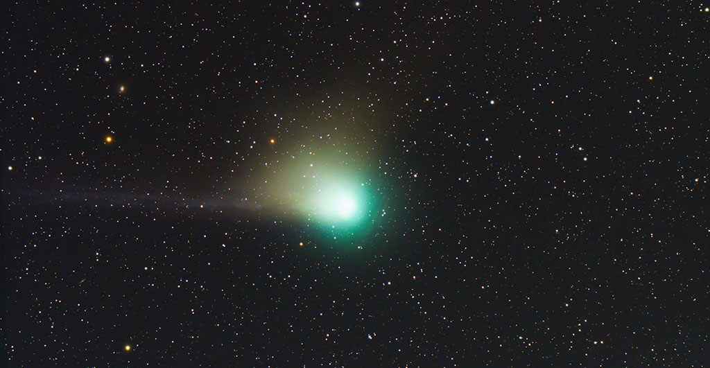 Die Aufnahme zeigt den „Grünen Kometen“, der offiziell als Komet C/2022 E3 ZTF geführt wird. Die intensive grüne Farbe der Gashülle (auch Koma genannt) erhält diese von der Emission des Dikohlenstoffs (C2), der nach Anregung durch Sonnenlicht besonders im grünen Spektralbereich strahlt. Vor einigen Tagen erreichte der Komet den sonnennächsten Punkt auf seiner Bahn und passiert in den kommenden Tagen die Planetenebene des Sonnensystems zwischen der Erde und dem Mars. Von der Erde aus gesehen, wird er dann durch das Sternbild Stier wandern und sich dem Mars am Himmel nähern. Da er sich allerdings von nun an wieder von der Erde und der Sonne entfernt, wird er in den kommenden Wochen kontinuierlich lichtschwächer, bis er schließlich auch mit Amateurteleskopen nicht mehr zu beobachten sein wird.