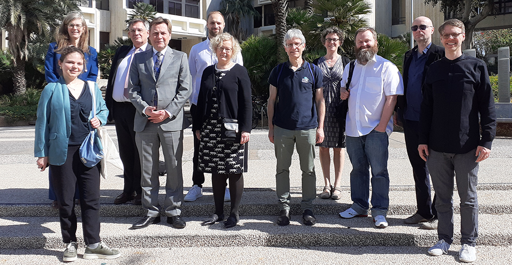 Foto: Die Delegation der Universität Potsdam um Uni-Präsident Prof. Oliver Günther, Ph.D. (4.v.l.) und den Vizepräsidenten für Internationales und Fundraising Prof. Dr. Florian J. Schweigert (3.v.l.) an der Tel Aviv University (TAU). Foto: Universität Potsdam.