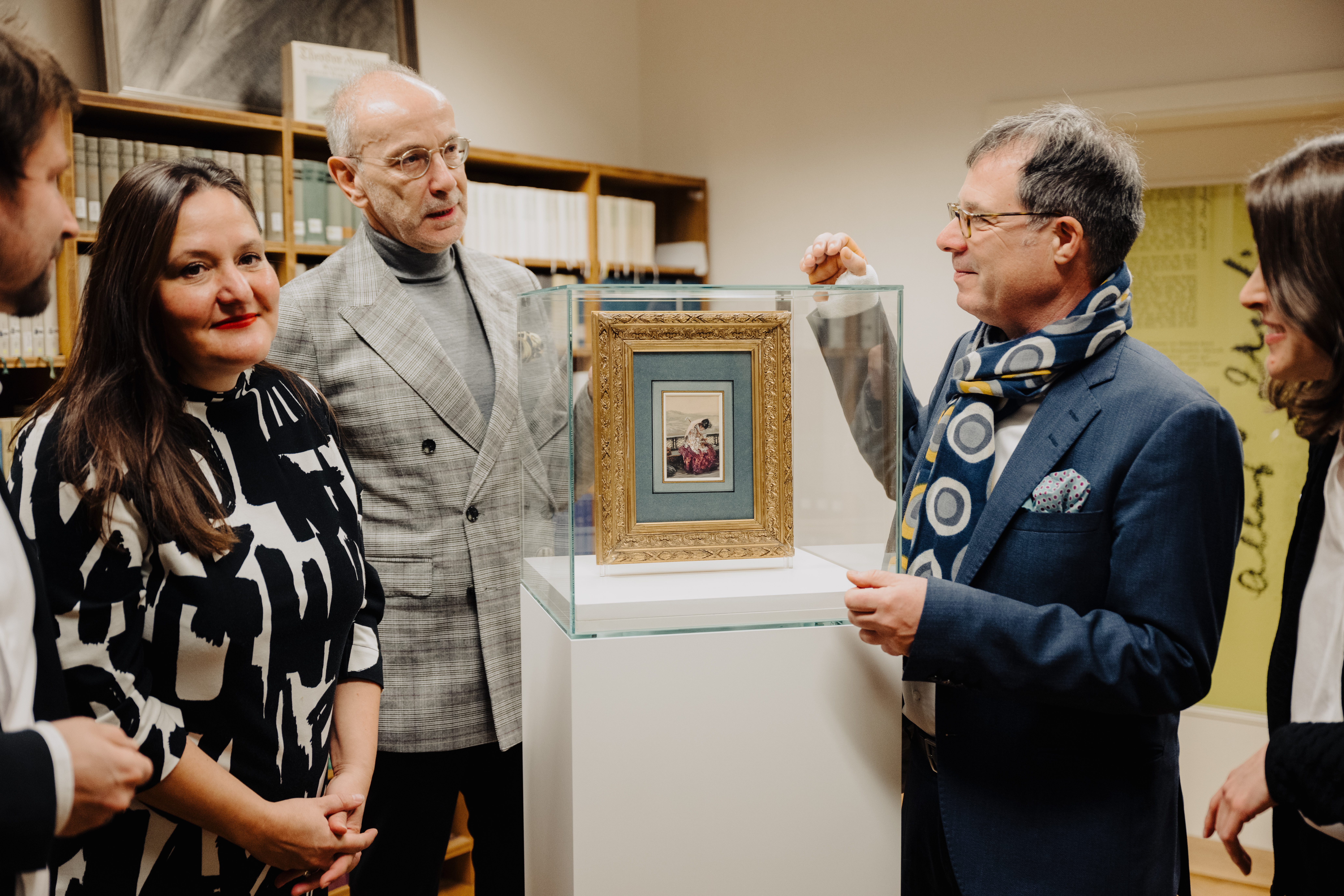 2023_11_15_FontaneArchiv_KevinRyl-8315 / 2023_11_15_FontaneArchiv_KevinRyl-8321: Bei der Präsentation des Bildes im Theodor-Fontane-Archiv. V.l.n.r.: Leiter des Theodor-Fontane-Archivs Professor Dr. Peer Trilcke, Ministerin für Wissenschaft, Forschung und Kultur des Landes Brandenburg Dr. Manja Schüle, stellvertretender Generalsekretär der Kulturstiftung der Länder Professor Dr. Frank Druffner, Generalsekretär der Ernst von Siemens Kunststiftung Dr. Martin Hoernes, stellvertretende Leiterin des Theodor-Fontane-Archivs Dr. Anna Busch. Foto: Kevin Ryl