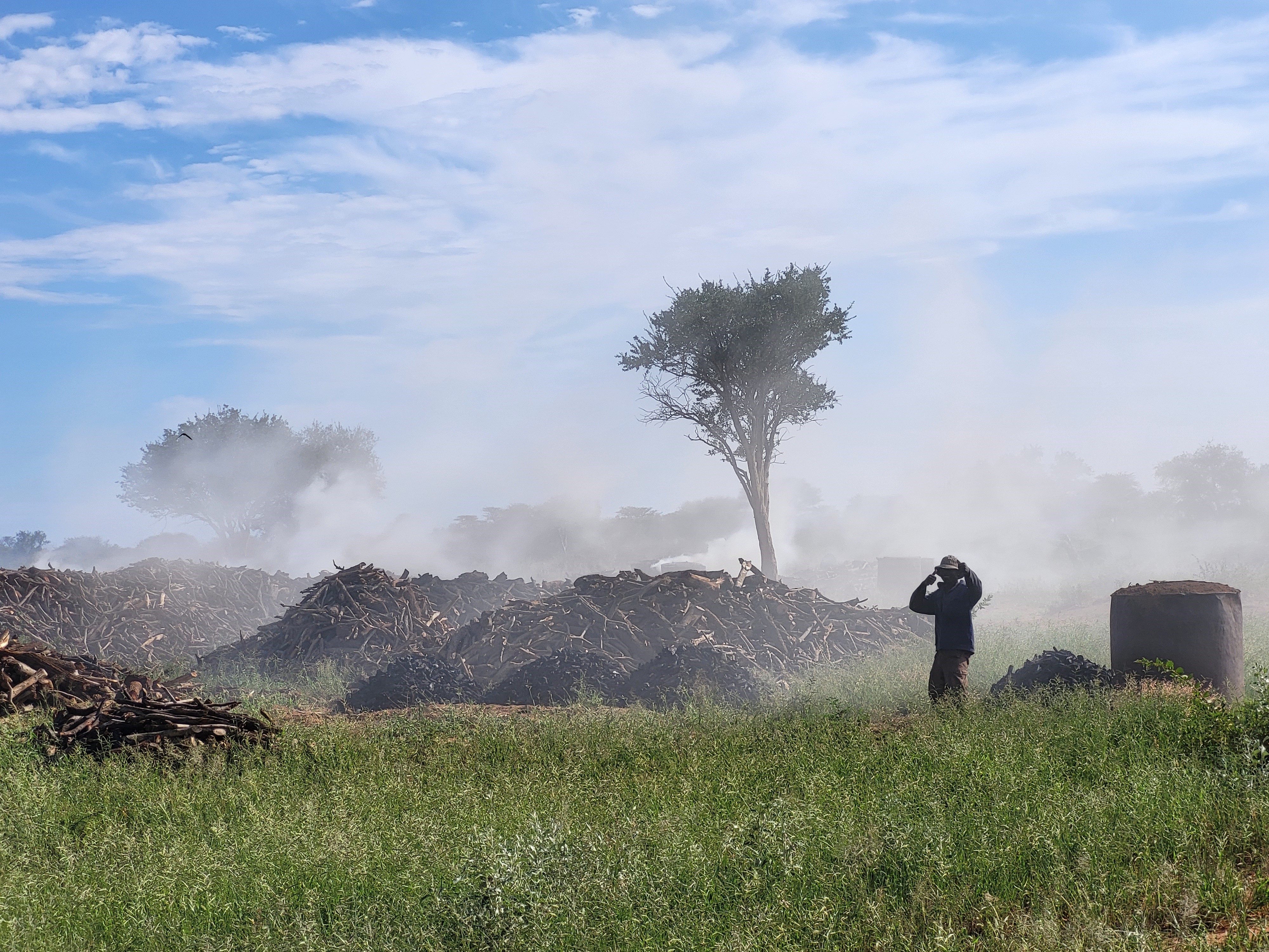 2024_096_Foto2_BushEncroachment_Namibia: Zur Bekämpfung der zunehmenden Dominanz holziger Pflanzen wird in Namibias Savannen seit einiger Zeit Holzkohle produziert. Dabei werden selektiv invasive Bauarten entfernt, um die Produktivität der Weideflächen zu verbessern. Foto: Prof. Dr. Anja Linstädter