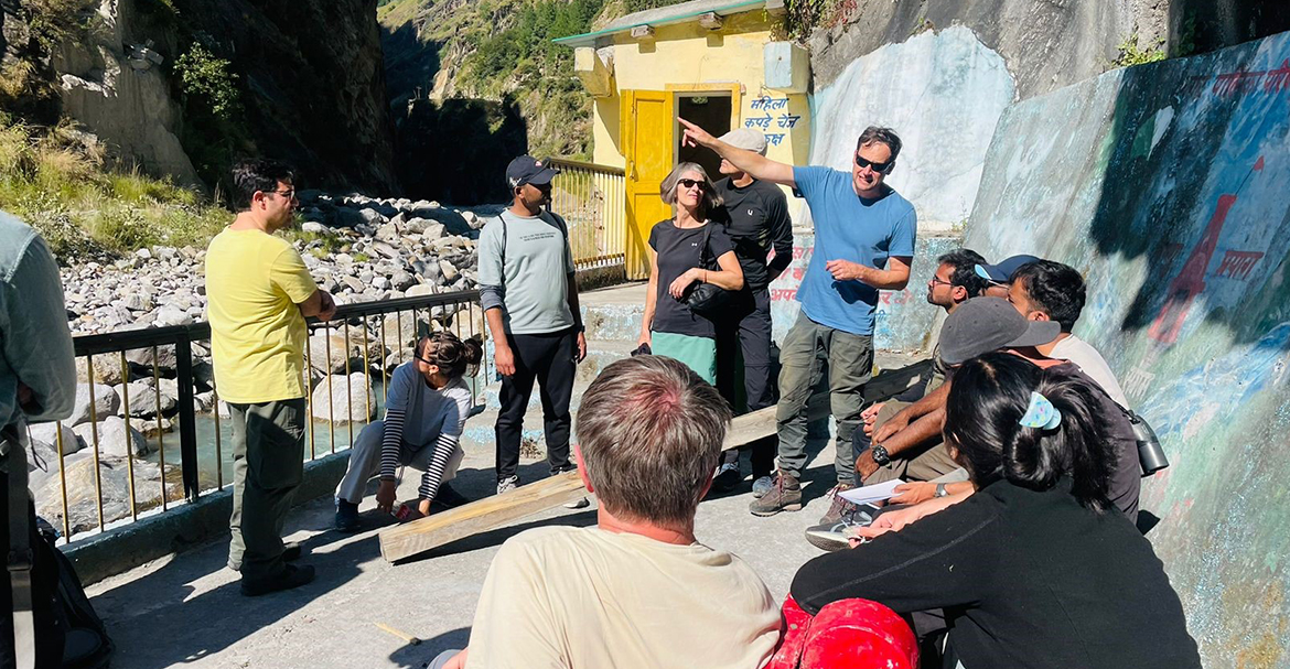 Auf unserer anschließenden Fahrt nach Joshimat machen wir Halt bei Vishnuprayag, dem ersten der fünf bedeutenden Zusammenflüsse in der Region, wo der Alaknanda auf den Dhauliganga trifft. Dieser Ort birgt jedoch eine dunklere Erinnerung. Im Februar 2021 wurde das Gebiet durch eine Eis- und Gerölllawine schwer verwüstet. Noch heute sind die Folgen sichtbar: Zerstörte Häuser, die Ruine einer Brücke und erodierte Hänge erzählen von der zerstörerischen Kraft der Natur. Unter der Leitung von Dr. Wolfgang Schwanghart diskutieren wir über die katastrophale Eis-Fels-Lawine, die die Flut auslöste, und ihre Auswirkungen auf die Region.