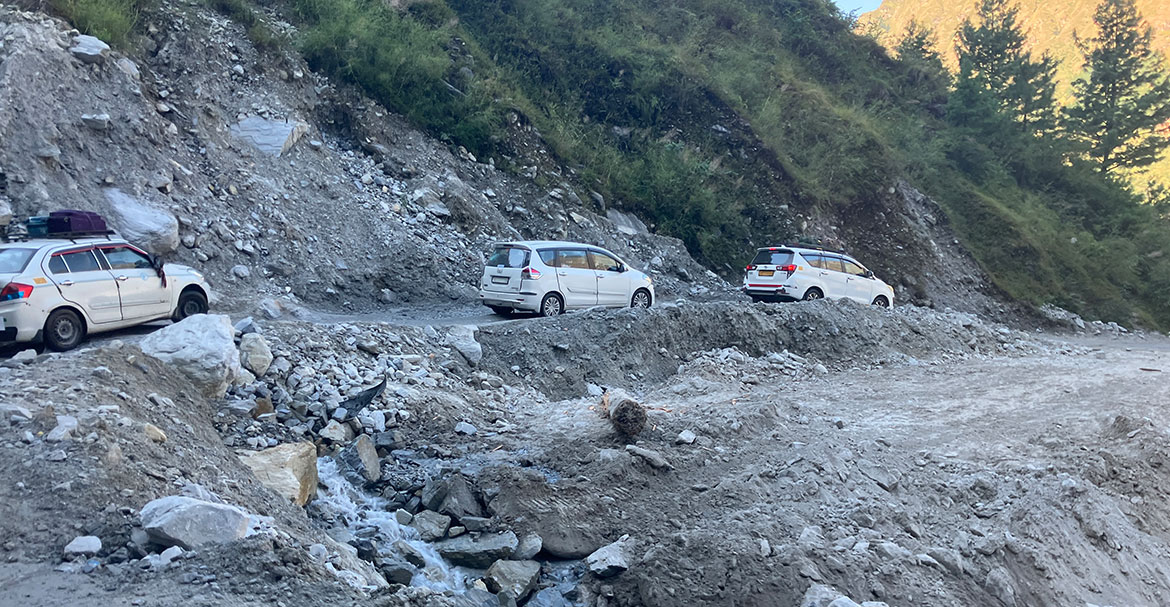 Heute lassen wir Joshimath und die über 6000 Meter hohen, schneebedeckten Berge hinter uns und fahren zurück in die Niederen Himalaya. Unser Ziel ist der Tehri-Staudamm, der höchste Staudamm Indiens, der den Bhagirathi-Fluss aufstaut. Die 250 Kilometer lange Strecke entlang der NH-7 dauert etwa acht Stunden. Daher brechen wir früh am Morgen auf, um dem dichten Verkehr und den langen Staus an Stellen, an denen Erdrutsche die Straße blockieren, zu entgehen.