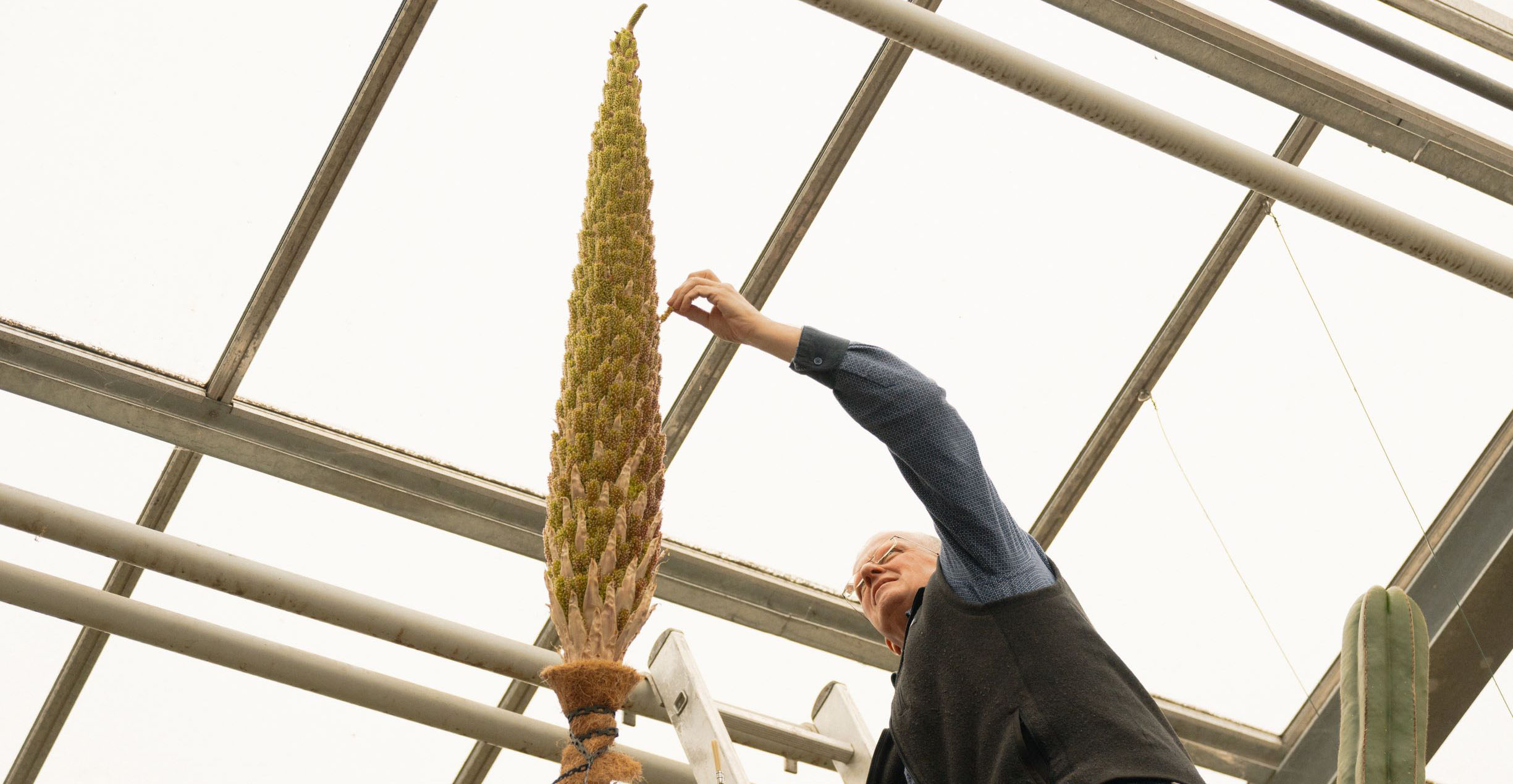 Er ist bereits 45 Jahre alt, blüht aber nun zum ersten Mal: der Stachellose Rauschopf (Dasylirion quadrangulatum) im Botanischen Garten der Universität Potsdam. Spektakulär ist der hohe Blühtrieb der an sich nur zwei Meter großen Pflanze. „Er reicht bis unter das Glasdach des Gewächshauses und musste mit Seilen zur Seite gezogen werden, um nicht oben anzustoßen“, berichtet der Kustos des Gartens, Dr. Michael Burkart. Dabei stellte sich heraus, dass es sich um eine weibliche Pflanze handelt. „Dank des Pollens eines zeitgleich blühenden männlichen Exemplars dieser Art im Botanischen Garten Berlin-Dahlem konnte die Potsdamer Pflanze bestäubt werden. Wenn das Experiment gelingt, werden sich Samen entwickeln“, hofft Burkart und dankt den Kolleginnen und Kollegen des Nachbargartens ausdrücklich. Die blühende Pflanze kann voraussichtlich bis in den Sommer im Kakteenhaus besichtigt werden.