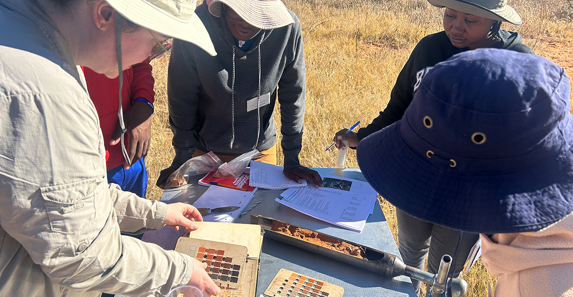 An der letzten Station führt uns die Doktorandin Katrin Zimmer von der Universität Bonn in grundlegende Techniken der Bodenbewertung ein. Dafür entnehmen wir Bodenproben mit einem Erdbohrer. Anschließend klassifizieren wir den Boden anhand der Munsell-Bodenfarbkarte, testen den pH-Wert und messen seine Feuchtigkeitsspeicherkapazität. Wir lernen, dass die Bodenfarbe Aufschluss über den Gehalt an organischem Kohlenstoff geben kann – dunklere Böden enthalten oft mehr Kohlenstoff.