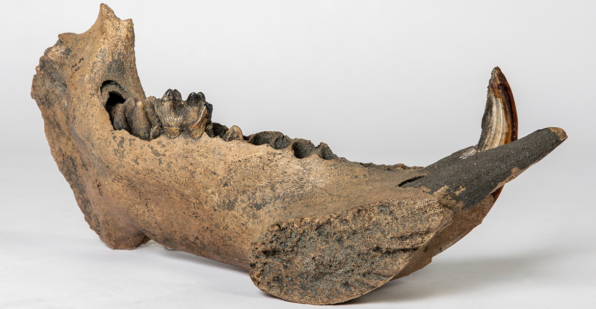 2025_091_NK24_Hippo_Mandible_rem: Linkes Unterkiefer-Fragment eines weiblichen Flusspferdes aus den Reiss-Engelhorn-Museen Mannheim (Slg. Reis Hippopotamus sp.). Altersdatierung: Zwischen 46.000 und 48.300 Jahre vor heute. Fundort: Bobenheim-Roxheim, Rhein-Pfalz-Kreis. Foto: Rebecca Kind