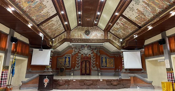 Zum Abschluss dürfen wir das Universitätsgebäude besichtigen. Wir sind beeindruckt vom Auditorium mit seiner detailreichen, farbenfrohen Wandgestaltung. Mit neuen Eindrücken und Erkenntnissen kehren wir zurück, bereits in Vorfreude auf unseren zweiten Besuch an der Udayana-Universität.