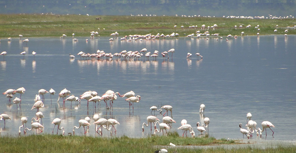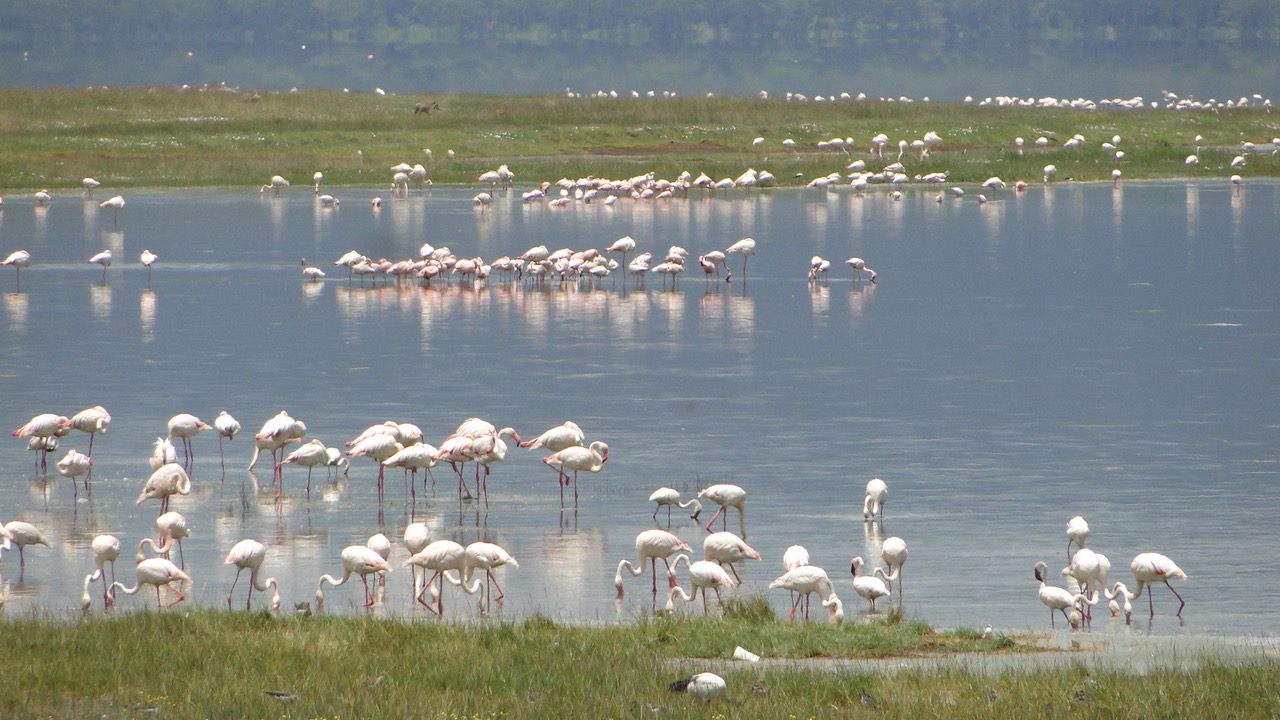 nakuru_Martin Trauth.jpg: The alkaline Nakuru Lake in Kenya is rich in the cyanobacterium Spirulina platensis, the basic food of the Lesser Flamingo. However, due to increasing rainfall in the region in recent years, the bacterium and with it the flamingos are disappearing. Image Credit: Martin Trauth.