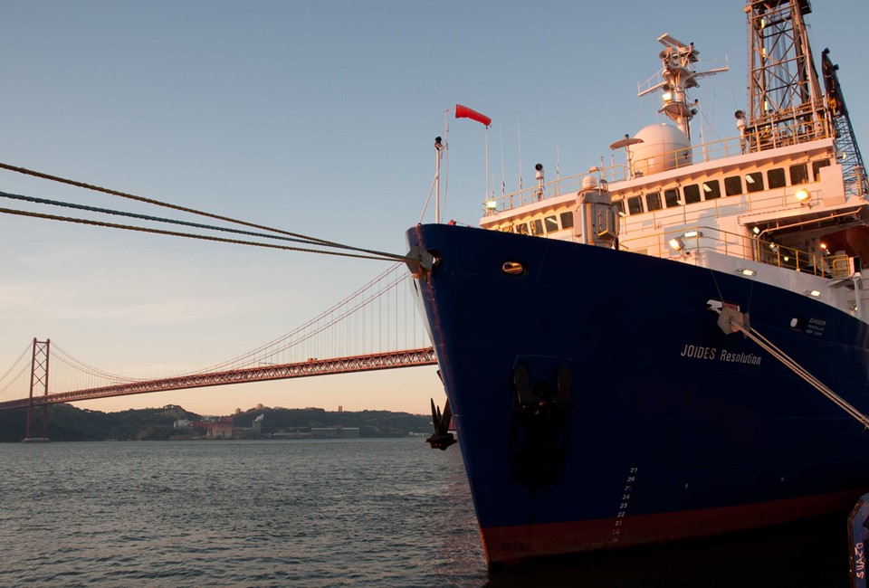 joides_resolution_a.bahr.jpg: The drillship R/V Joides Resolution, used to drill the cores investigated in this study, at berth in the harbor of Lisbon (copyright: André Bahr, Heidelberg University).